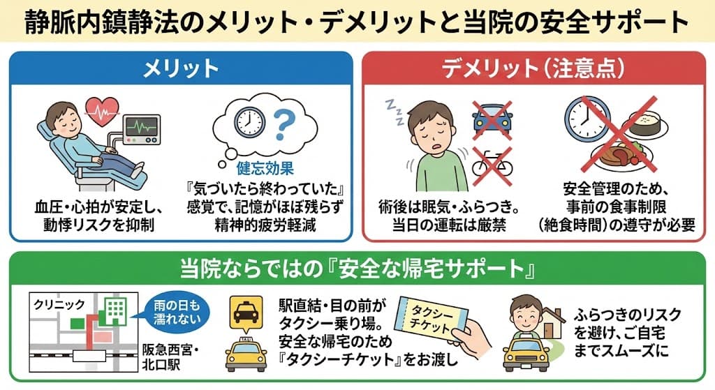 デメリット(注意点) 術後は眠気やふらつきが残るため、当日の自転車・自動車の運転は厳禁です。また、安全な麻酔管理のために、事前の食事制限(絶食時間など)を守っていただく必要があります。