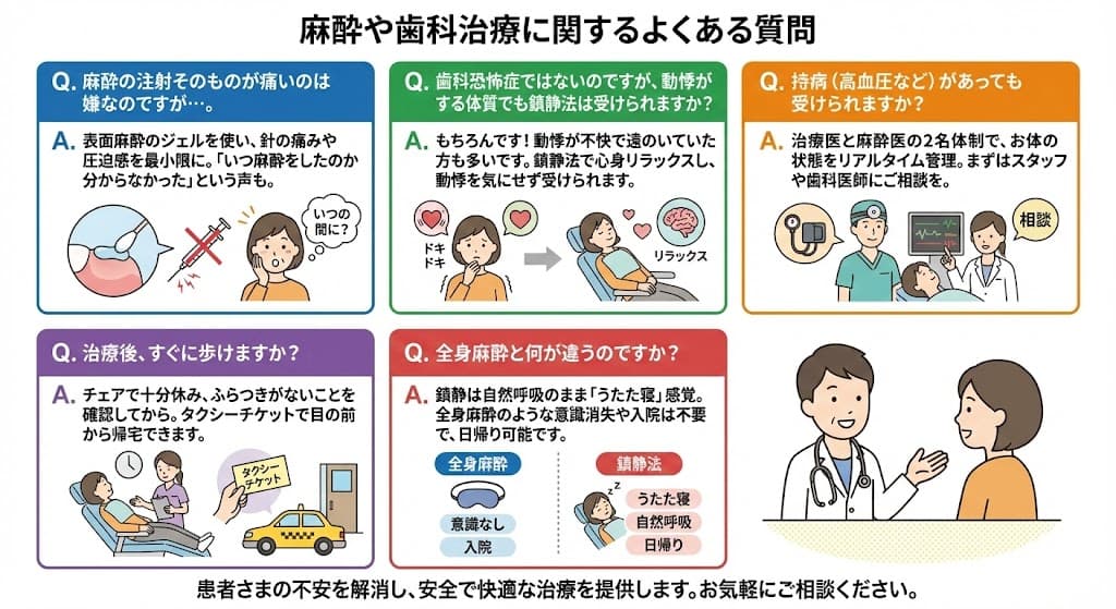 Q. 持病(高血圧など)があっても受けられますか? A. 当院では治療医と麻酔医の2名体制で、お体の状態をリアルタイムで管理しながら対応いたします。まずはスタッフや歯科医師に現在の体調をご相談ください。