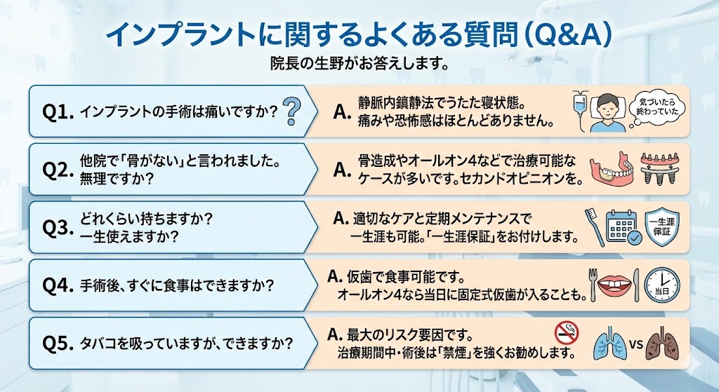 ここでは、カウンセリングで患者様からよくいただくご質問に、院長の生野がお答えします。