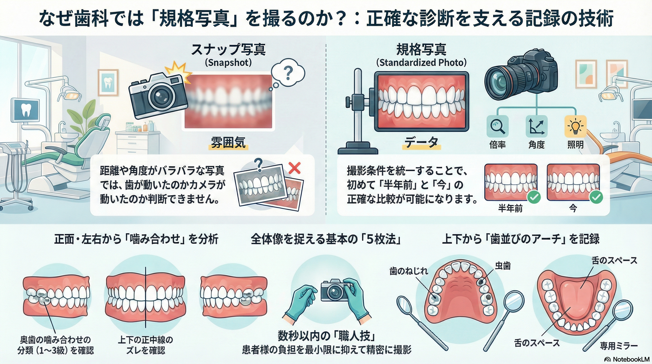 歯科医院で撮影する口の中の写真には、大きく分けて2種類あります。一つは、気になった部分をパッと撮る「スナップ写真」。そしてもう一つが、私たちが徹底している「規格写真(きかくしゃしん)」です。