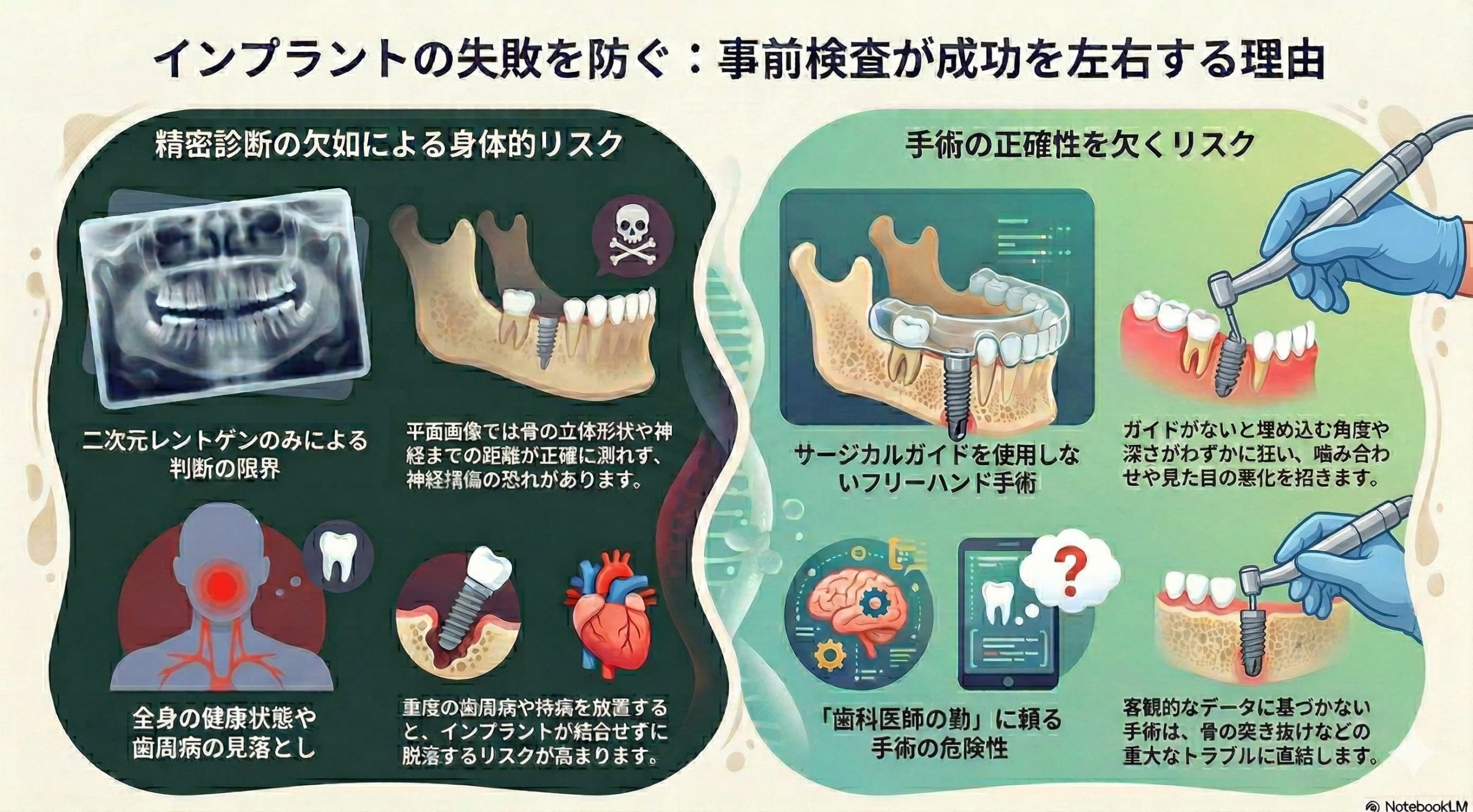 前章で挙げたトラブルの多くは、実は手術そのものの手技の失敗というよりも、事前の検査が不十分であったために起こります。インプラント治療において、なぜ入念な事前検査がそれほどまでに重要なのか、検査不足が引き起こす具体的なリスクについて解説します。