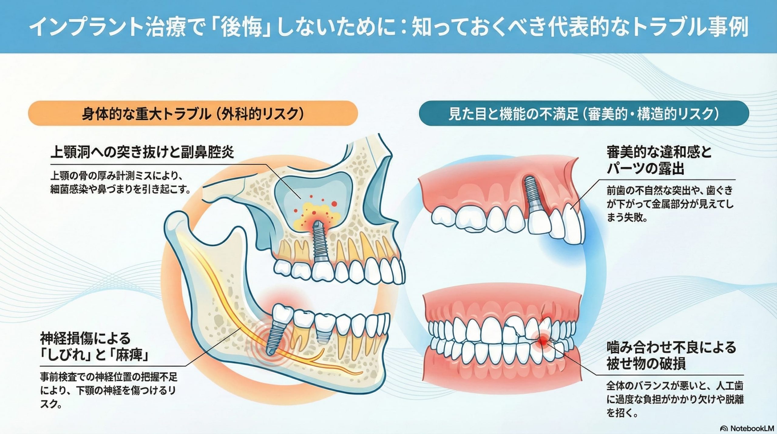 インプラント治療後に患者さまが後悔を感じてしまうケースには、いくつかの共通点があります。ここでは、身体的なトラブルから見た目の不満まで、具体的にどのような問題が起こり得るのかをわかりやすく解説します。