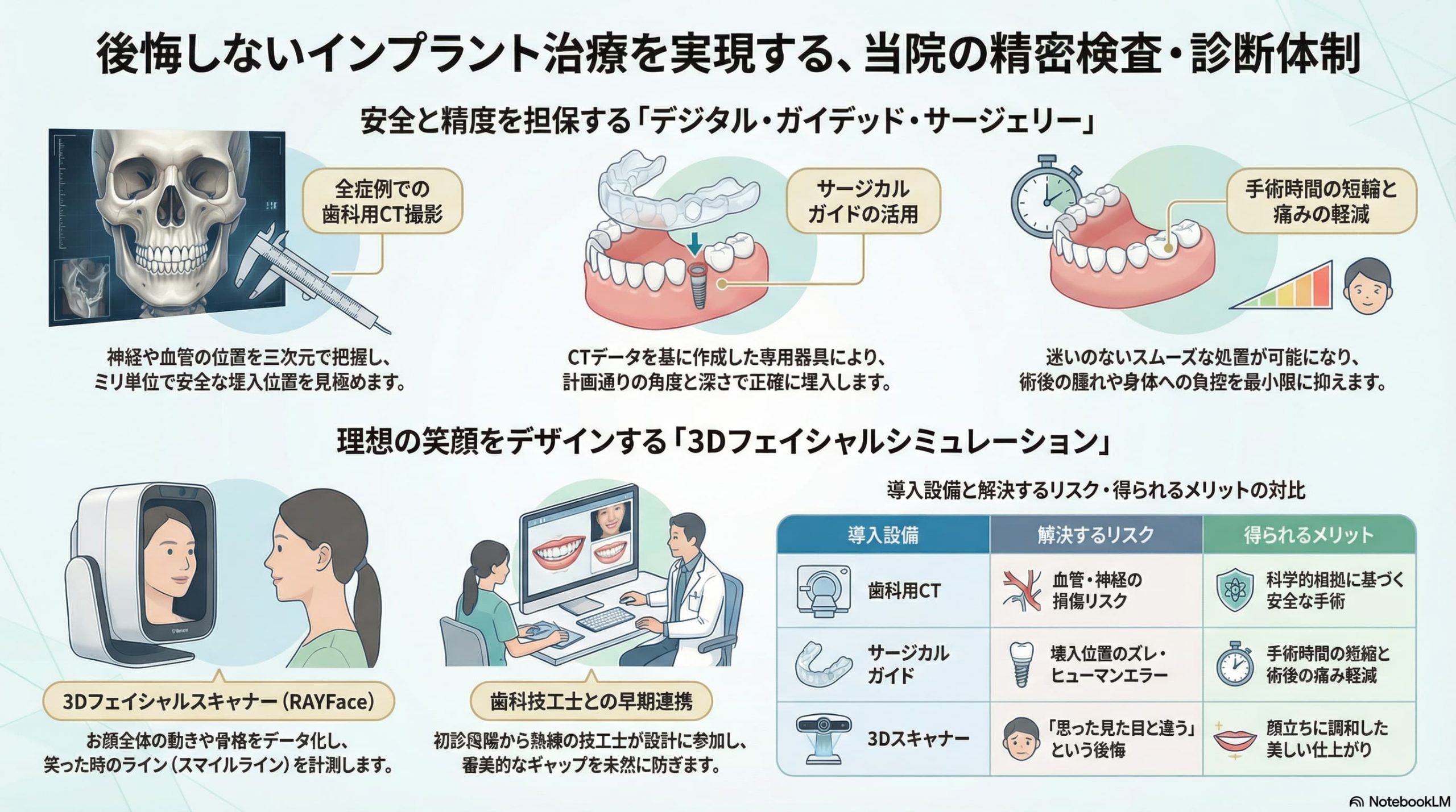インプラント治療で後悔する多くのケースが、事前の検査不足やそれに伴う計画の甘さに起因しています。これを防ぐためには、歯科用CTによる三次元診断やサージカルガイドを用いたミリ単位の精密な計画が不可欠です。
