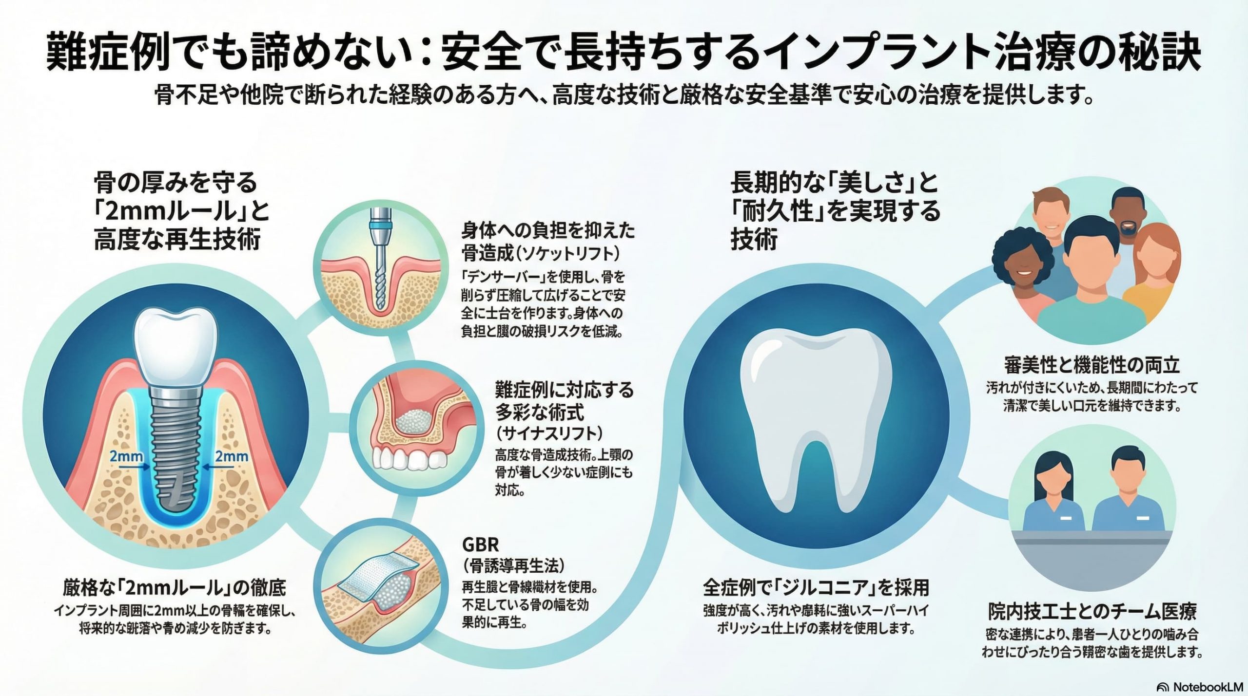 - 僕(生野院長)の経験上、そう言われた患者さんでも治療可能なケースは実はたくさんあります!当院では、GBRやサイナスリフトといった骨を増やす(造成する)高度な技術に対応していますし、どうしても骨造成を避けたい場合には、短くて太い「ショートインプラント」を使うなど、様々な引き出しを用意しています 。まずはCTを撮って、本当に骨がないのか、どうすれば安全にできるのかを一緒に確認しましょう。