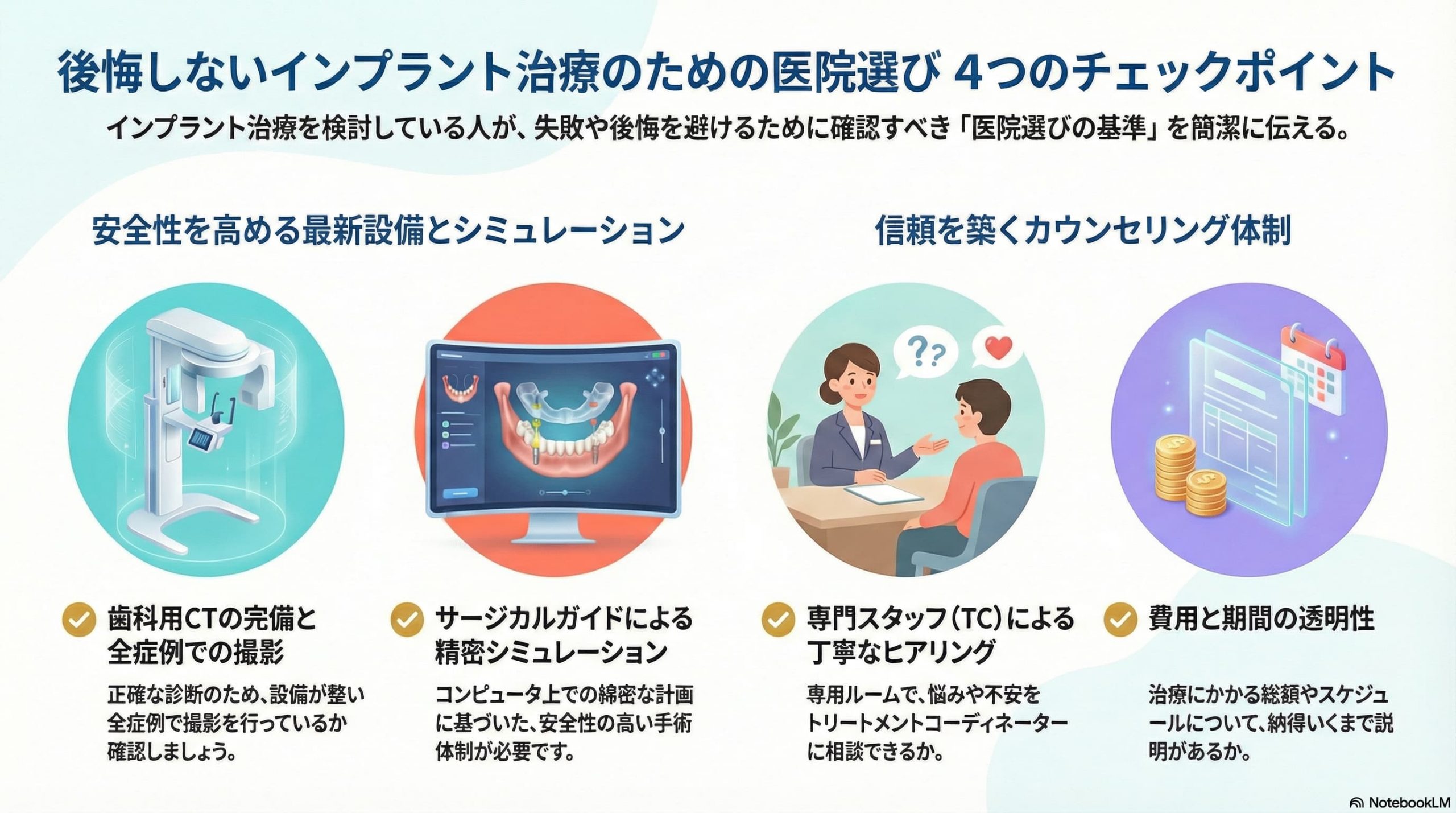 インプラント治療において、医院選びは成功を左右する最も重要な決断です。これまでお伝えしてきた通り、設備が整っていない医院や、十分な説明なしに治療を進める医院では、後悔するリスクが高まります。 医院選びの際は、必ず「歯科用CT設備が完備され、全症例で撮影しているか」「サージカルガイドを用いた綿密なシミュレーションを行っているか」を確認してください。また、ご自身の不安や疑問に対して、トリートメントコーディネーター(TC)などが専用のカウンセリングルームで丁寧にヒアリングし、費用や期間を含めて納得いくまで説明してくれるかどうかも、信頼できる医院を見極める大切なポイントになります 。