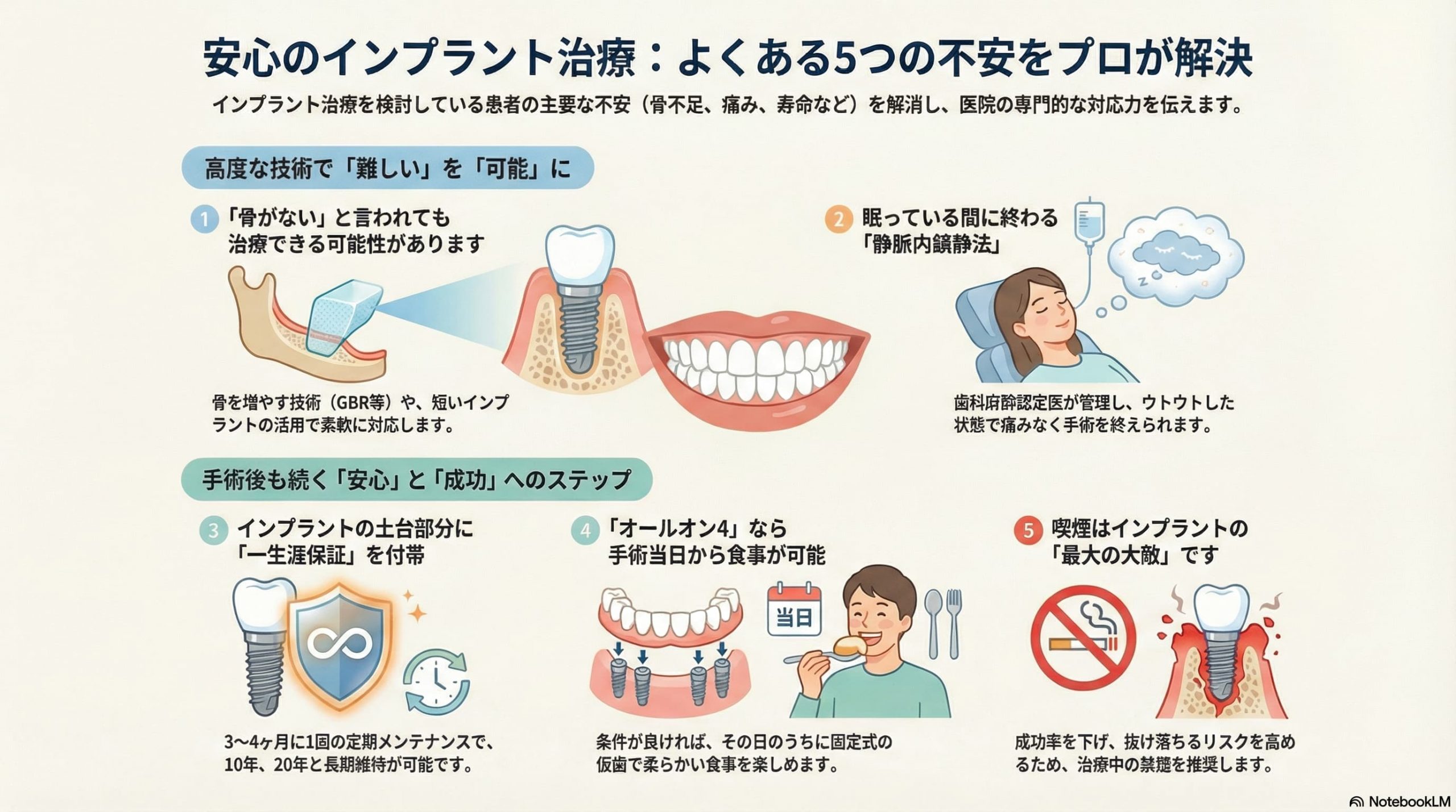 当院では、大学病院レベルの最新設備による精密検査と、各分野のスペシャリストによるチーム医療で、患者さまの不安を徹底的に取り除く安全な治療を提供しています 。他院で「骨がない」と断られてしまった方や、手術の痛みが怖くて一歩踏み出せない方も、決して諦める必要はありません。まずは当院の専用カウンセリングルームへ、どうぞお気軽にご相談にお越しください 。患者さまの「人生のパートナー」として、最適な解決策をご提案いたします 。