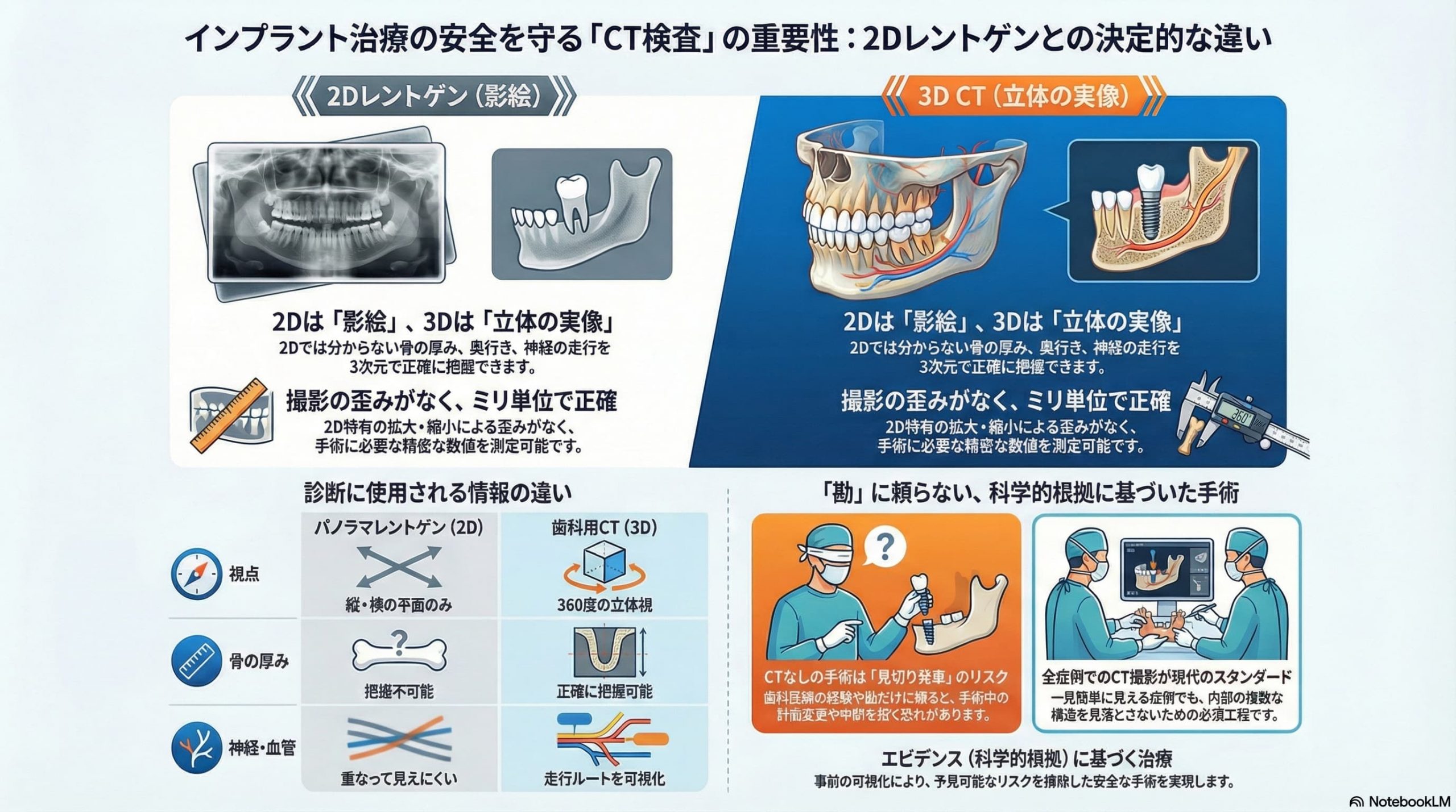 「レントゲンだけの診断」と「CTによる3次元診断」では、見えている世界が全く異なり、それはそのまま安全性の差に直結します。