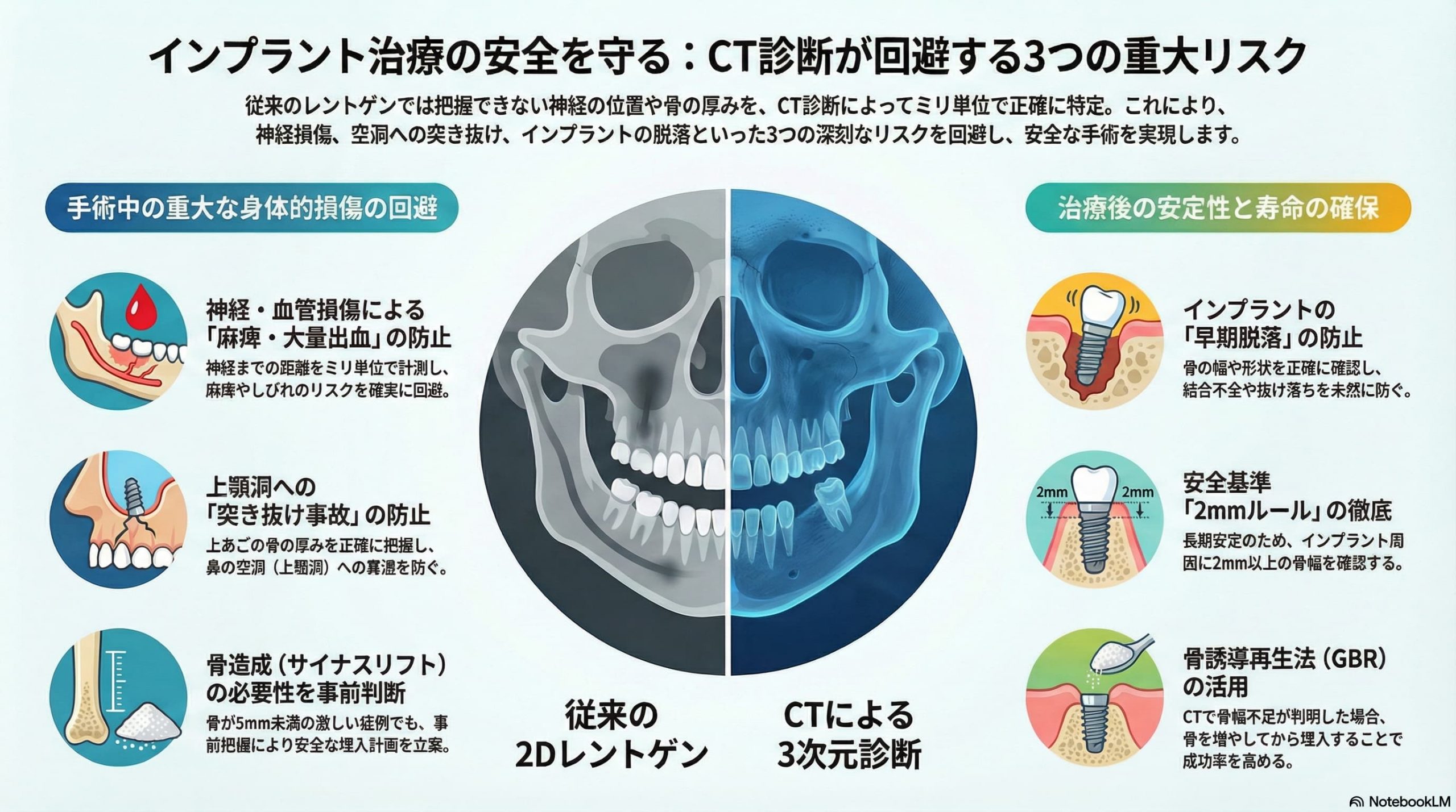 特に、外科手術を伴うインプラントにおいて「安全性」は最も重要な要素です。その安全性を担保する最大の鍵となるのが、**歯科用CTによる「3次元診断」です。