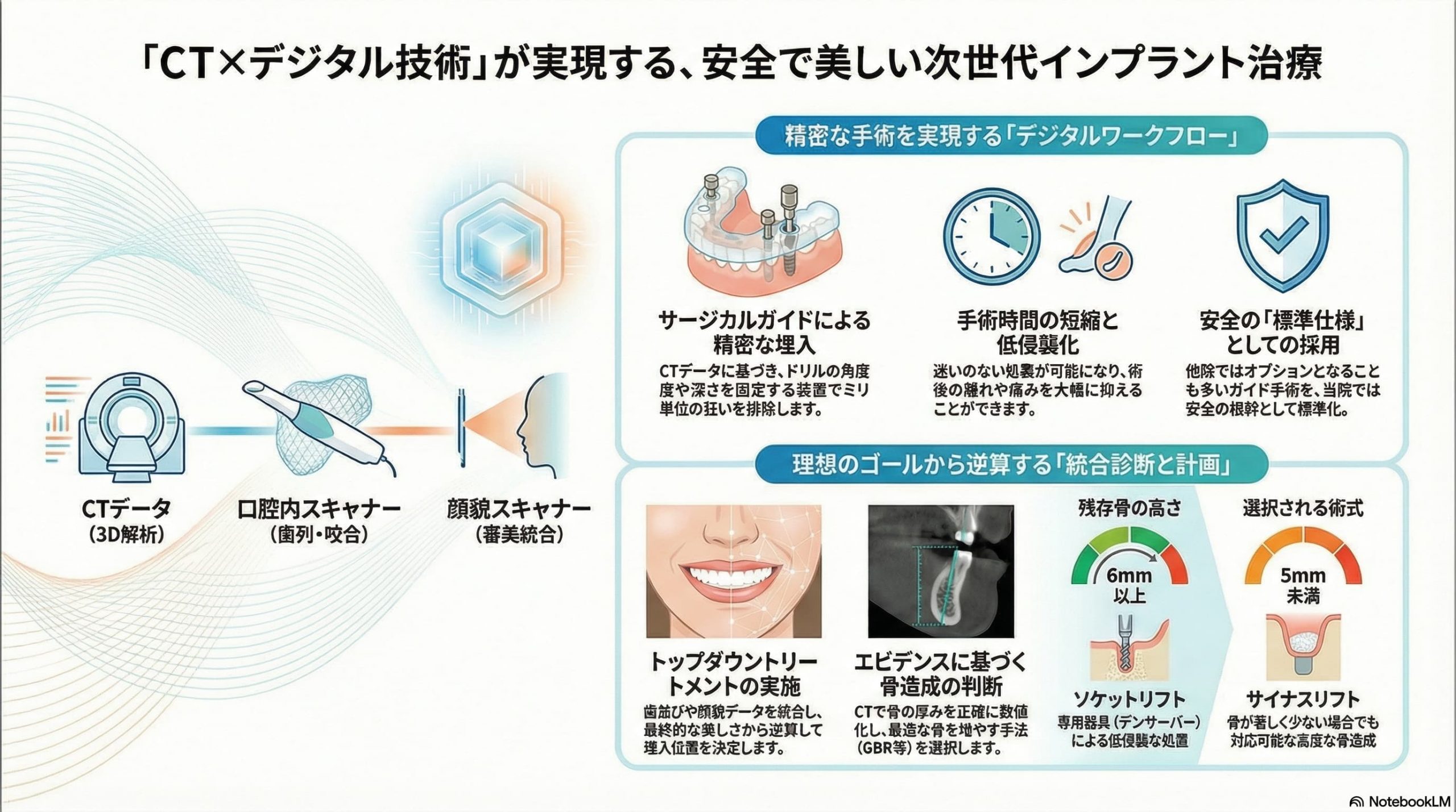 骨がある場所にただ埋めるのではなく、「最終的に美しく噛める歯が入る位置」や「顔の形に調和する位置」から逆算してインプラントの位置を決定する**「トップダウントリートメント」**が可能になります。これにより、機能的で見た目も美しいインプラントを実現します 。