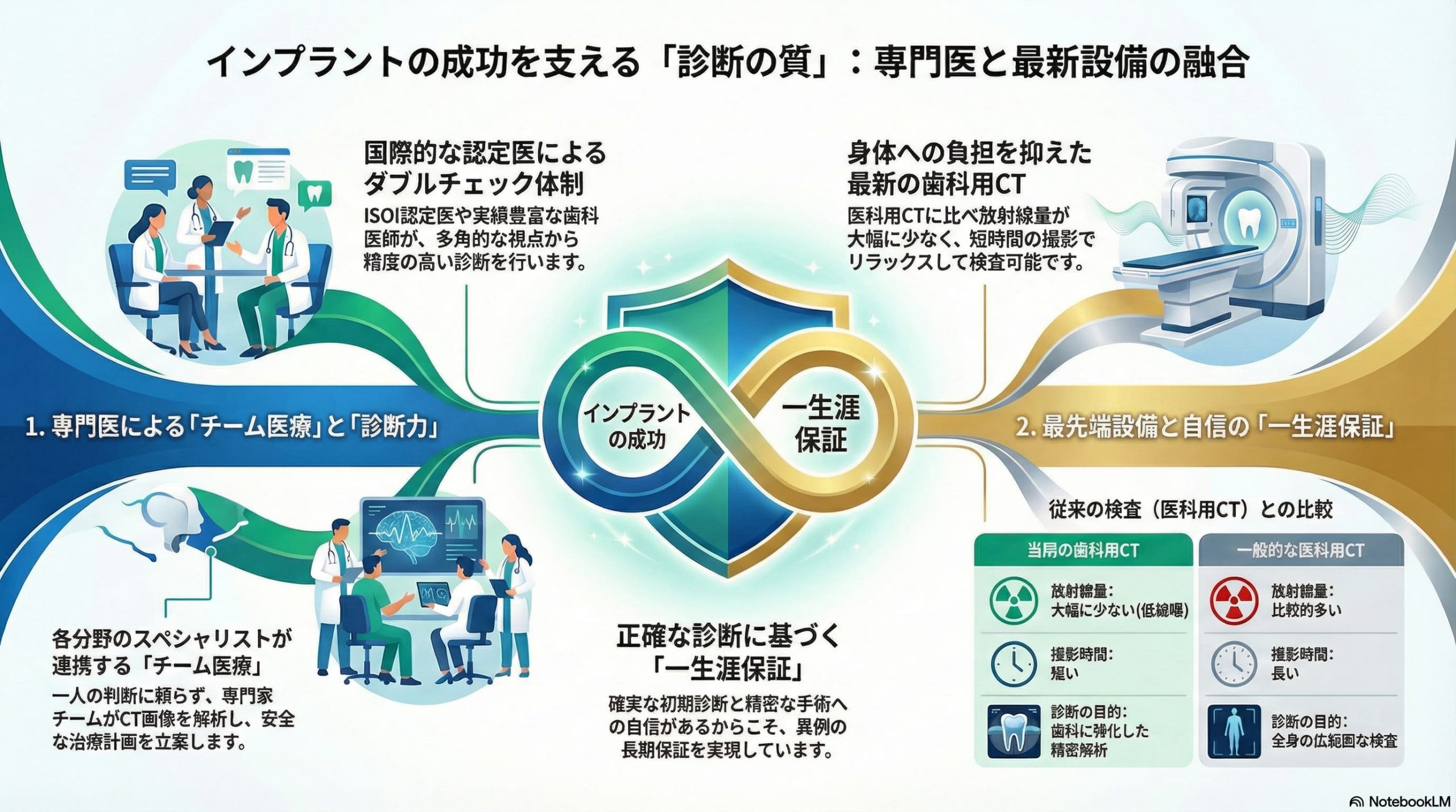 一人の歯科医師の判断だけでなく、各分野のスペシャリストがチームとしてCT画像を解析し、包括的かつ安全な治療計画を立案する「チーム医療」を実践しています 。