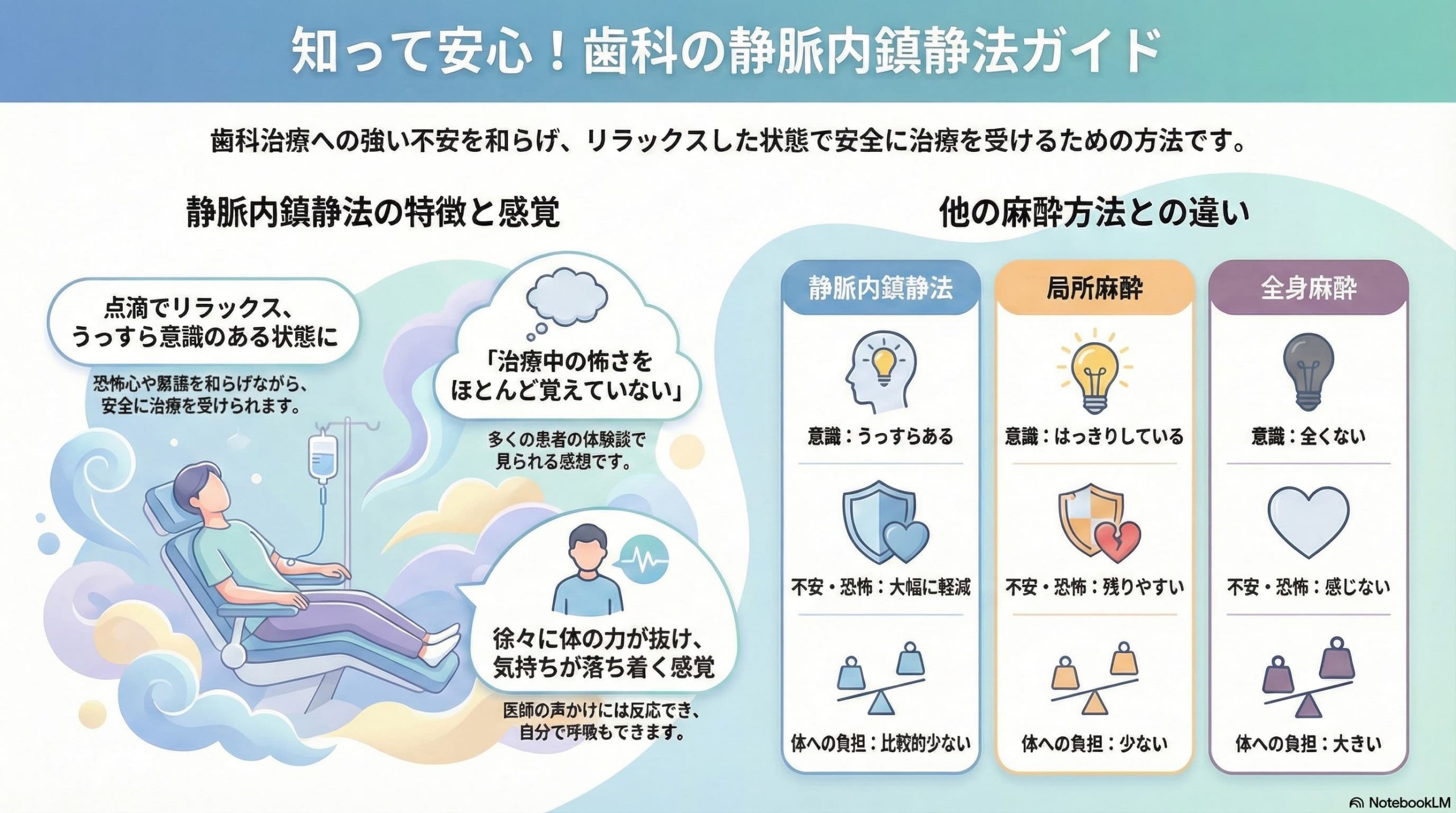 実際の声を踏まえてまとめているため、「自分が受けたらどう感じるのか」を具体的にイメージしやすく、静脈内鎮静に対する不安を和らげる内容になっています。
