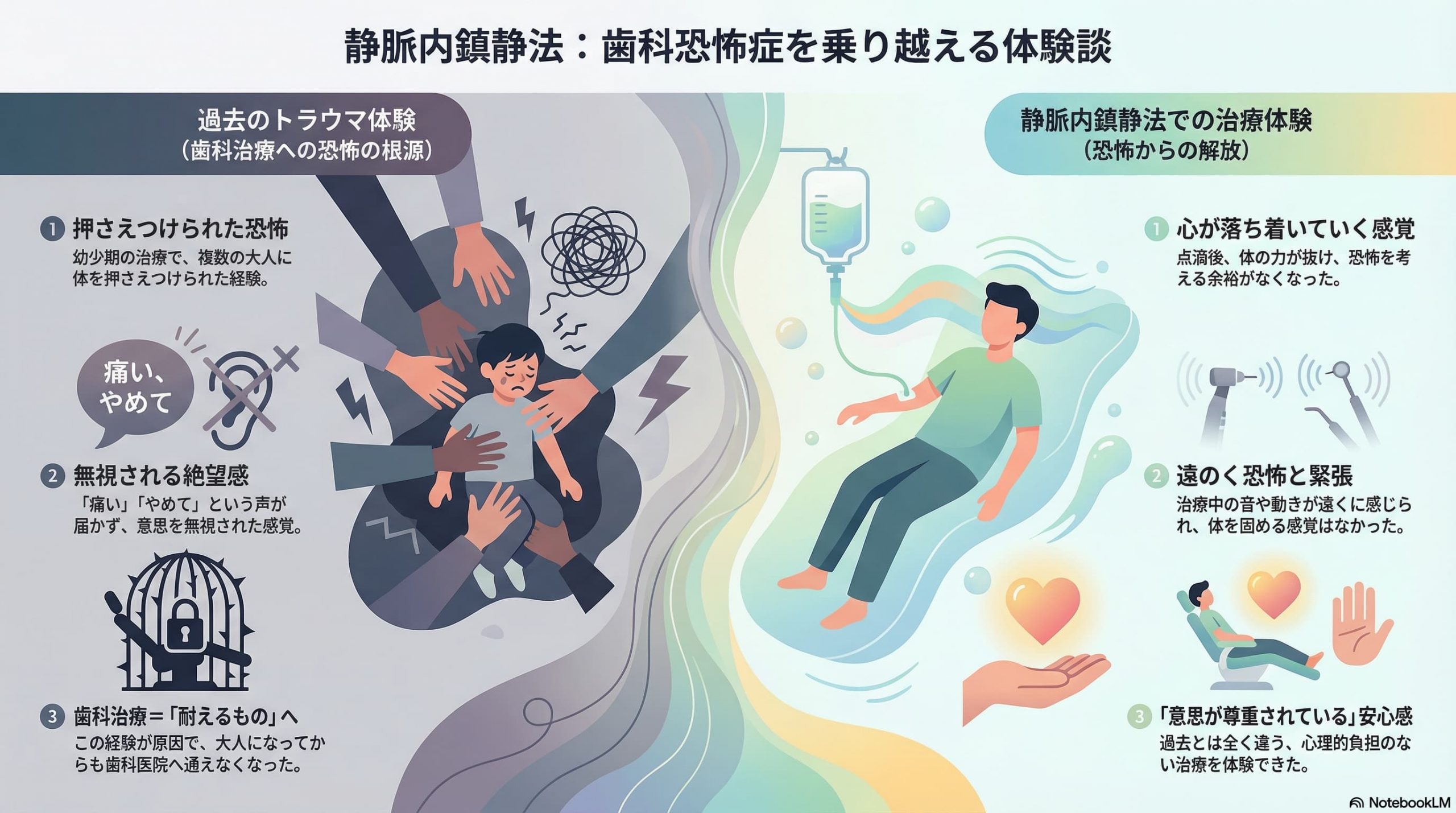 この方の場合、その恐怖の根底には、幼少期の歯科治療でのつらい記憶がありました。