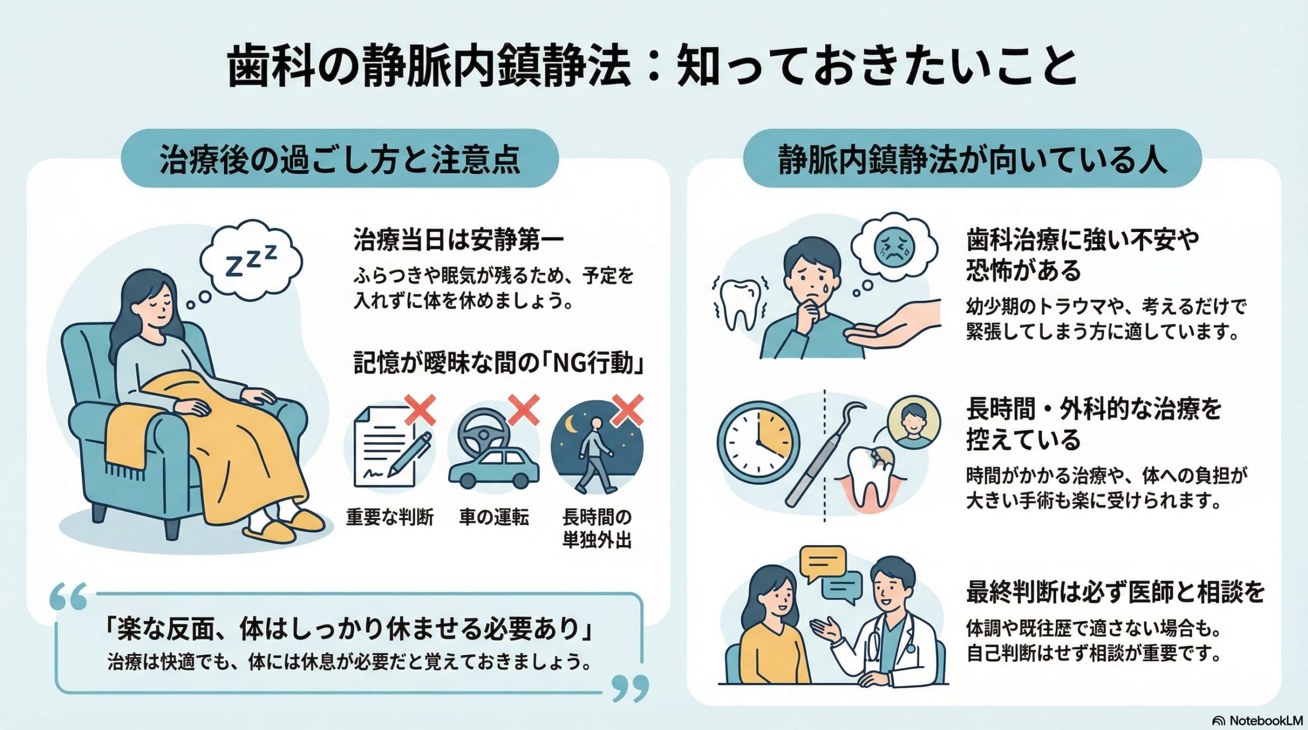 静脈内鎮静を検討する際は、治療内容だけでなく、気持ちの面も含めて相談することが大切だといえます。