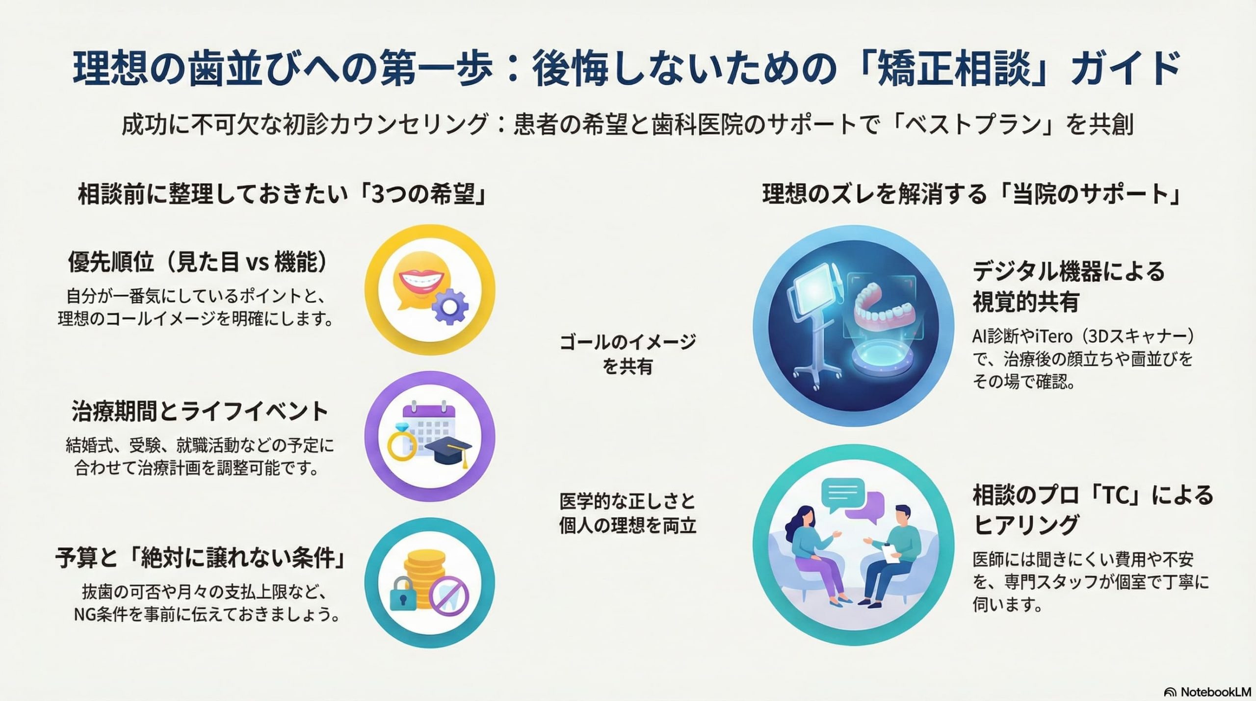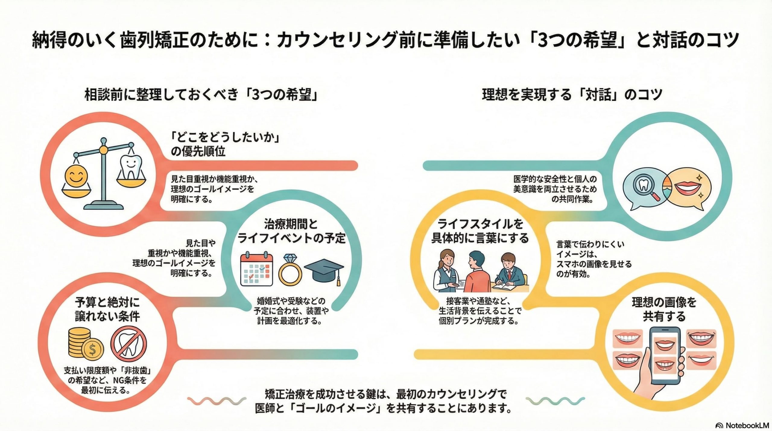 矯正治療の成功は、医師の技術だけでなく、「いかに詳細に希望を伝え、医師とゴールを共有できるか」にかかっています。