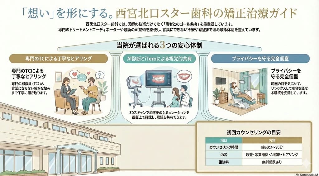 この記事では、ご自身の希望を的確に伝えるための準備のコツと、私たち西宮北口歯医者スター歯科が行っている「患者様の理想を1mmのズレもなく共有するための取り組み(AI診断・TC制度)」について詳しく解説します。 これから矯正相談に行かれる方の、不安解消の一助となれば幸いです。