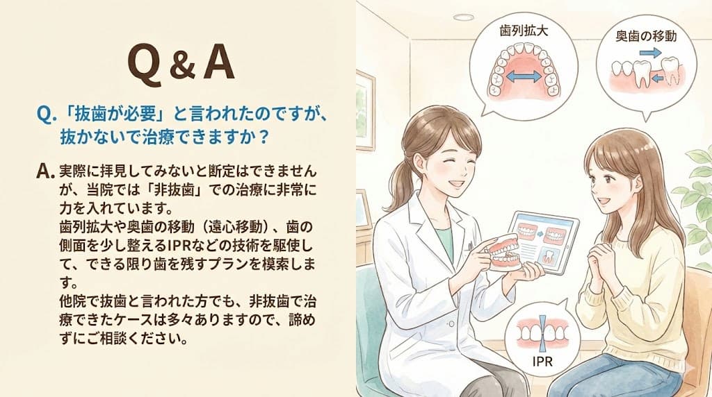A.実際に拝見してみないと断定はできませんが、当院では「非抜歯」での治療に非常に力を入れています。歯列拡大や奥歯の移動(遠心移動)、歯の側面を少し整えるIPRなどの技術を駆使して、できる限り歯を残すプランを模索します。他院で抜歯と言われた方でも、非抜歯で治療できたケースは多々ありますので、諦めずにご相談ください。