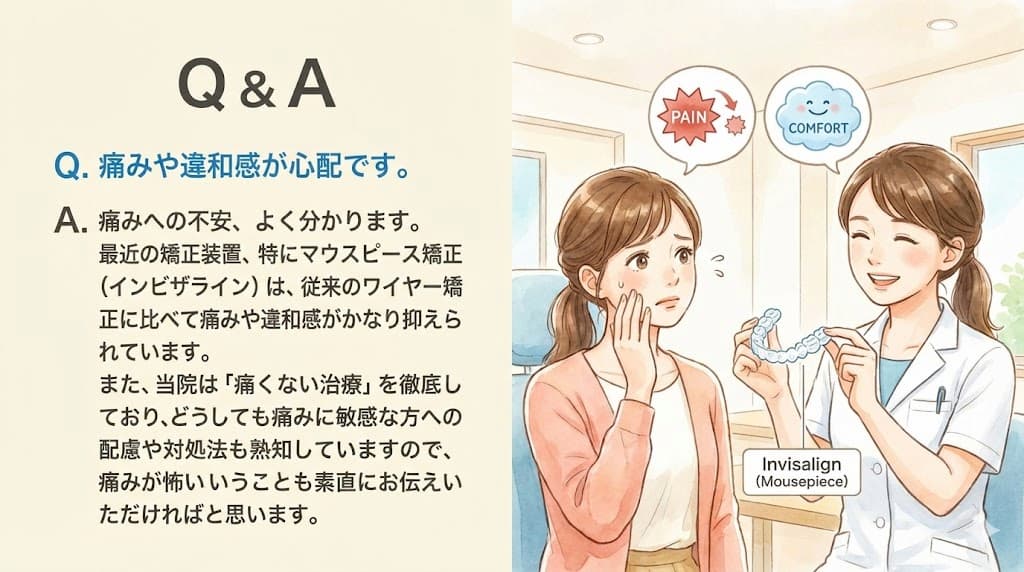 A. 痛みへの不安、よく分かります。最近の矯正装置、特にマウスピース矯正(インビザライ. ン)は、従来のワイヤー矯正に比べて痛みや違和感がかなり抑えられています。また、当院は 「痛くない治療」を徹底しており、どうしても痛みに敏感な方への配慮や対処法も熟知してい ますので、痛みが怖いということも素直にお伝えいただければと思います。