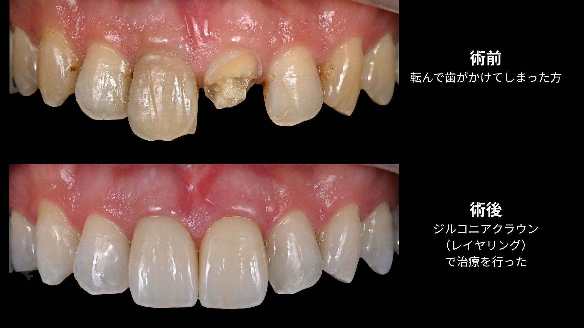 スター歯科クリニック西宮北口駅前院では、前歯のクラウンにおいて即日ブロックを使用せず、ジルコニアフレームに陶材をレイヤリングする高精度製作を基本としています。これにより、歯の内部からの光の反射や透明感を忠実に再現し、隣在歯との調和を図ります。