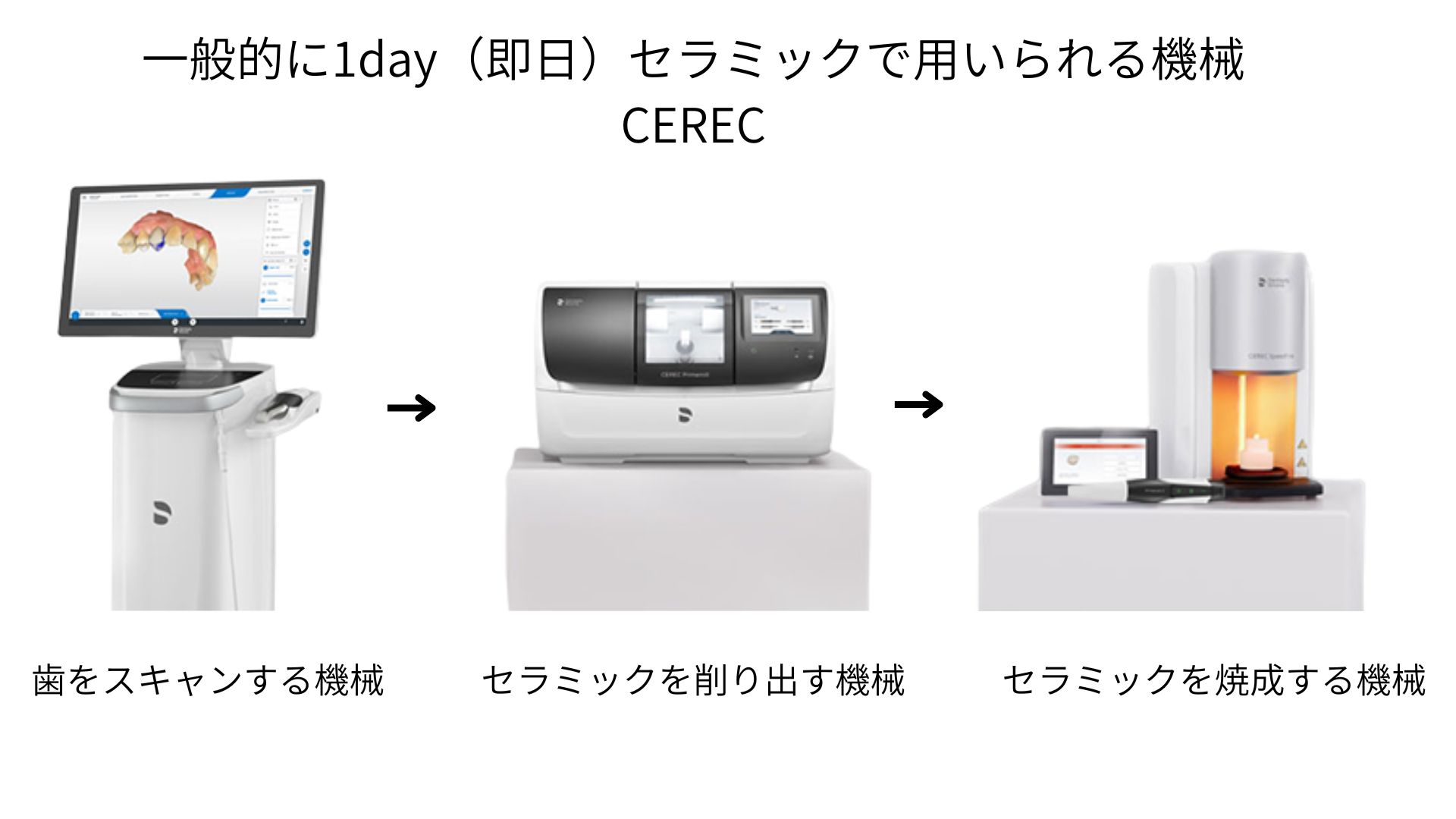 「1Dayセラミック治療」とは、従来のように歯型を採って技工所に依頼することなく、その日のうちにセラミックの被せ物・詰め物を製作・装着できる治療法です。