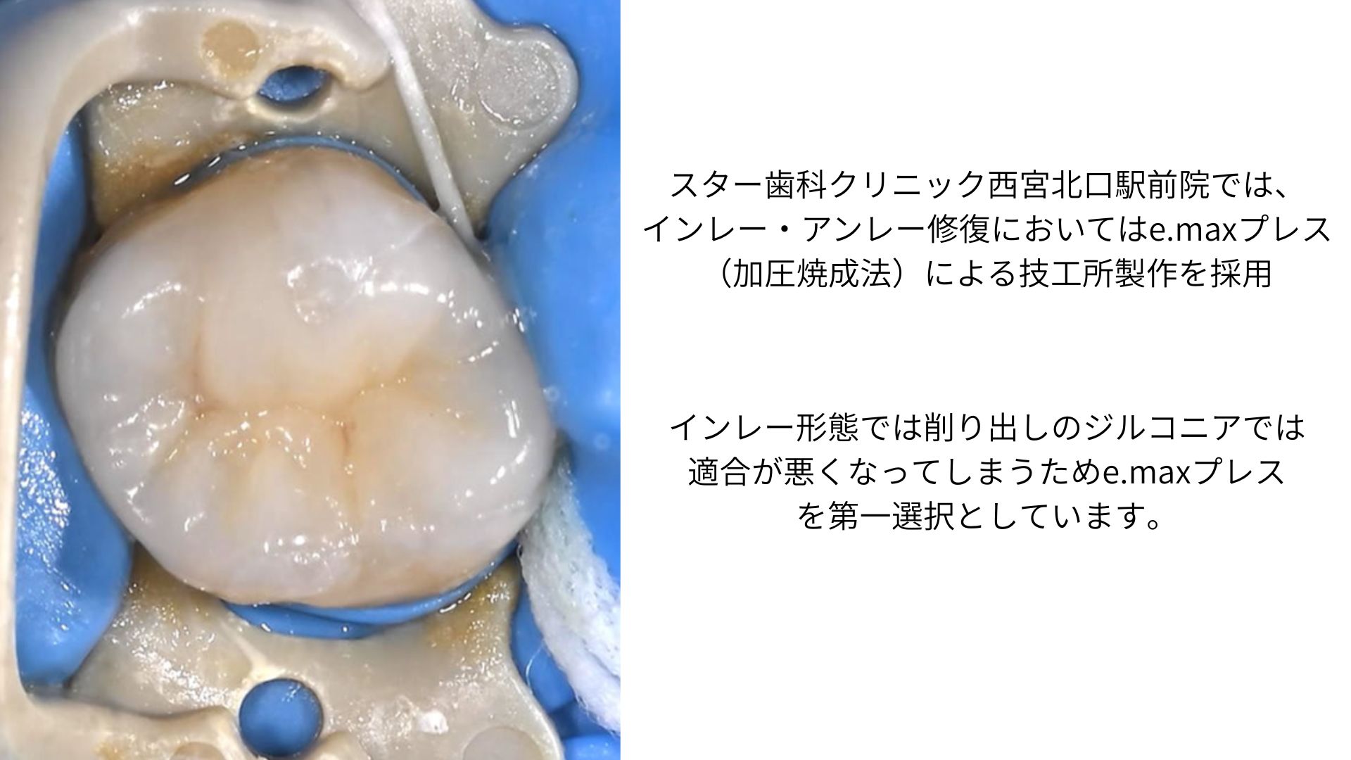 スター歯科クリニック西宮北口駅前院では、インレー・アンレー修復においてはe.maxプレス(加圧焼成法)による技工所製作を採用しています。圧力と熱で均一に成形されるため、マージンの適合精度が非常に高く、噛み合わせの安定にも優れます。