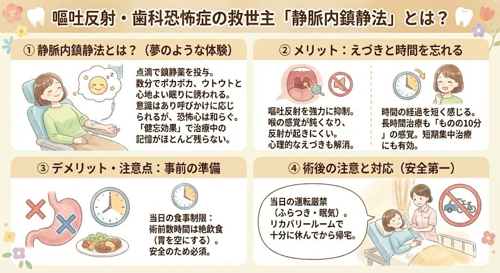 静脈内鎮静法の最大のメリットは、嘔吐反射そのものを強力に抑制できる点にあります。ウトウトしている間に処置が進むため、喉の奥を触られているという感覚が鈍くなり、反射が起きにくくなります。また、精神的なリラックス効果により、過度な緊張による「心理的なえづき」も解消されます