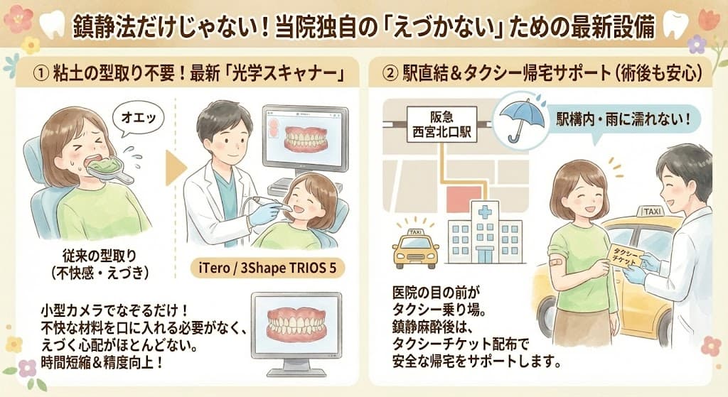 Q:本当に「オエッ」となりませんか? A:100%と言い切ることは医学的に難しいですが、鎮静薬によって喉の反射が大幅に鈍くなるため、多くの方が「全くえづかずに終わった」と驚かれます。さらに当院では、カメラで型取りをする「光学スキャナー」も併用するので、物理的にえづく原因そのものを減らす工夫をしています。