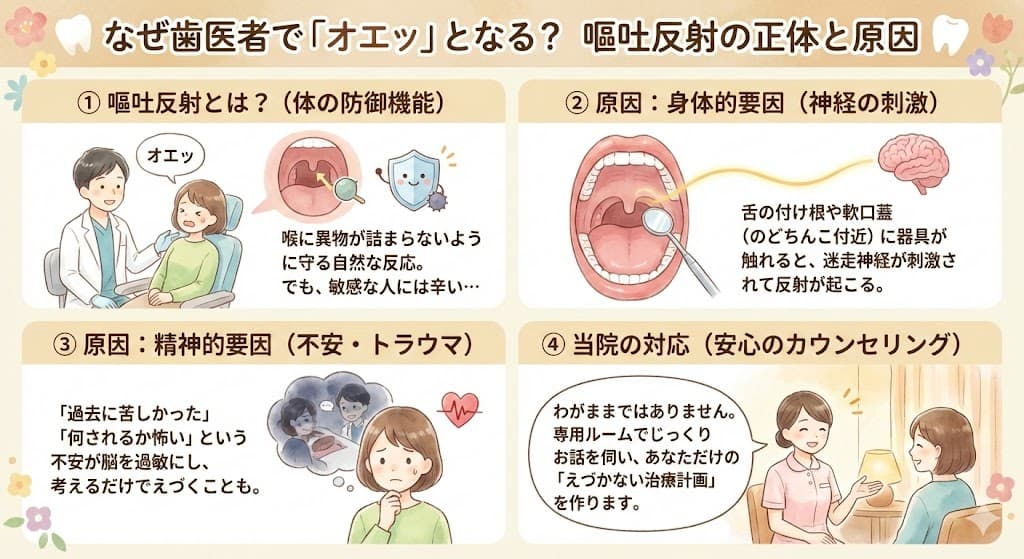 嘔吐反射が強くなる原因は、大きく分けて二つあります。一つは解剖学的な「身体的要因」です。舌の付け根や軟口蓋(喉に近い柔らかい部分)に器具や型取りの材料が触れることで、迷走神経が刺激されて反射が起こります。もう一つは、過去のトラウマや緊張からくる「精神的要因」です。「以前の治療で苦しい思いをした」「口の中に何を入れられるか分からない」という不安が脳を過敏にさせ、器具が触れる前から、あるいは考えただけでえづいてしまうケースもあります
