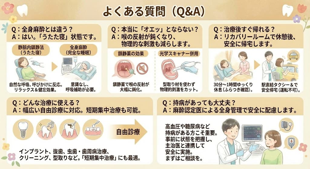 Q:麻酔の費用以外に、どんな治療にも使えますか? A:インプラント手術だけでなく、親知らずの抜歯、虫歯治療、歯周病の外科処置、定期的なクリーニングあるいは「型取りだけがどうしても怖い」という場合でも、自由診療の範囲内でご利用いただけます。複数の治療をまとめて行う「短期集中治療」との相性も非常に良いですよ。