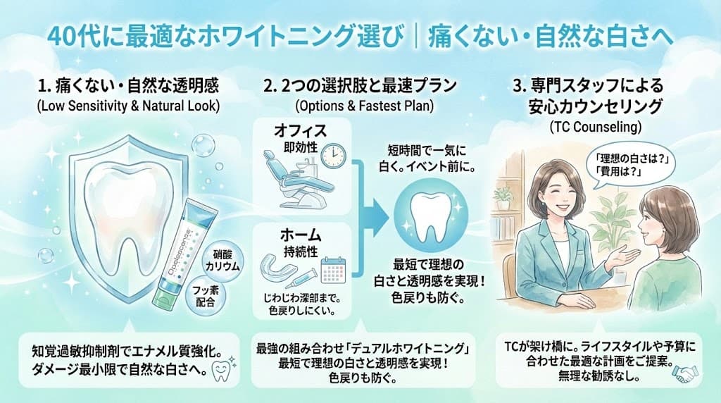 2. 40代に最適なホワイトニング選び|痛くない・自然な白さへ