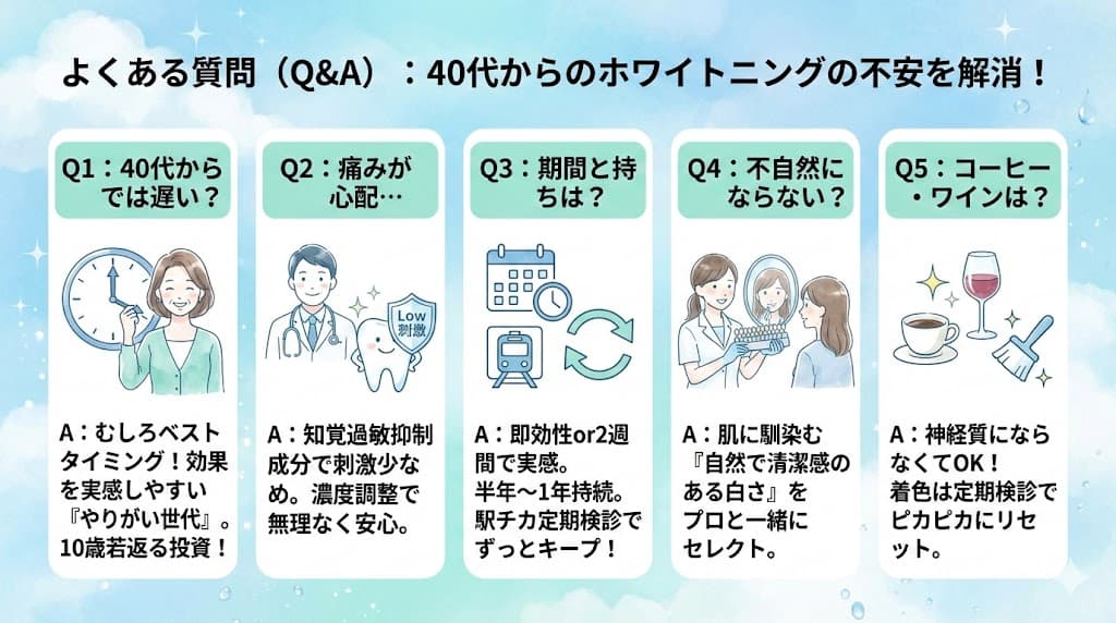 Q1:40代でホワイトニングを始めるのは遅すぎませんか? 「いえいえ、全くそんなことはありませんよ!むしろ40代は、長年の蓄積汚れが目立ち始める時期なので、ホワイトニングの効果を一番実感しやすい、いわば『やりがいのある』世代なんです。歯が白くなるだけで、本当にお顔全体の印象がパッと明るくなって、10歳くらい若返って見える方もたくさんいらっしゃいます。今からでも決して遅くありませんし、これからの人生をより楽しく過ごすための素敵な投資だと思います。」