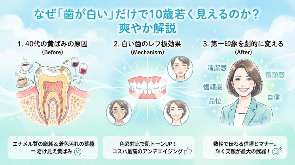 一方で、40代以降に目立ち始める歯の黄ばみは、どうしても「生活感」や「加齢」を感じさせる要因となります。お肌のケアには余念がなくても、口元のケアが疎かになっていると、ふとした笑顔の瞬間に老けた印象を与えてしまいかねません。40代こそ、効率的に若々しさを引き出す「口元のアンチエイジング」に注力すべき時期といえます。