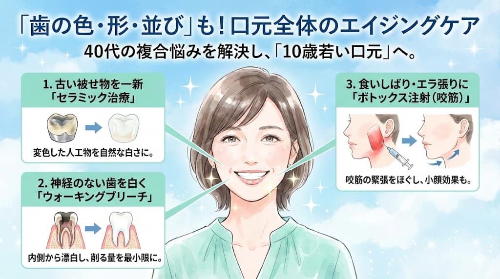 せっかくホワイトニングで歯が白くなっても、古い被せ物の変色や、わずかな歯並びの乱れが残っていると、本当の意味での若々しさは完成しません。40代の口元悩みは複合的であり、歯の色、形、そして機能面のすべてが整ってこそ、自信に満ちた笑顔が生まれます。