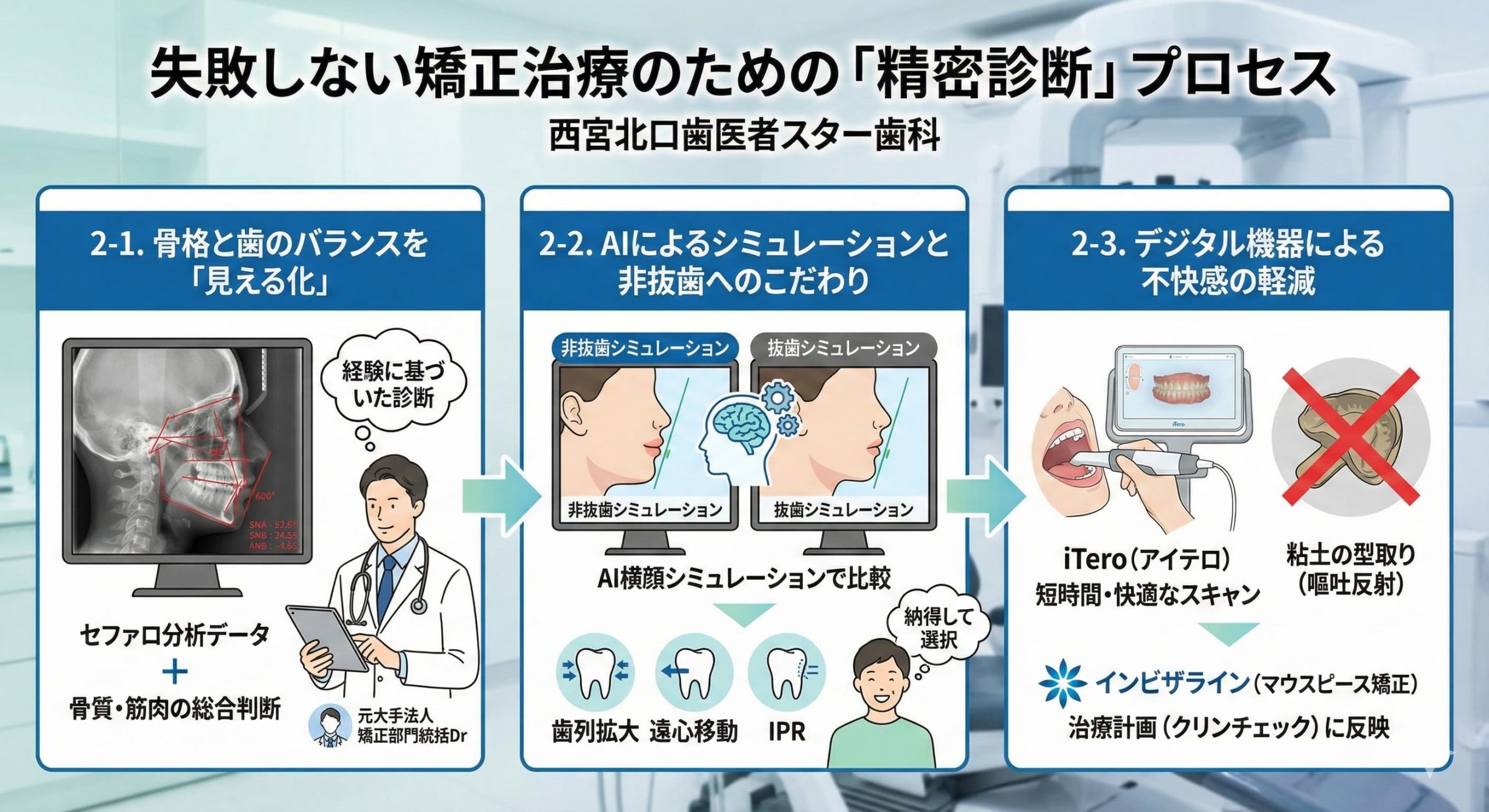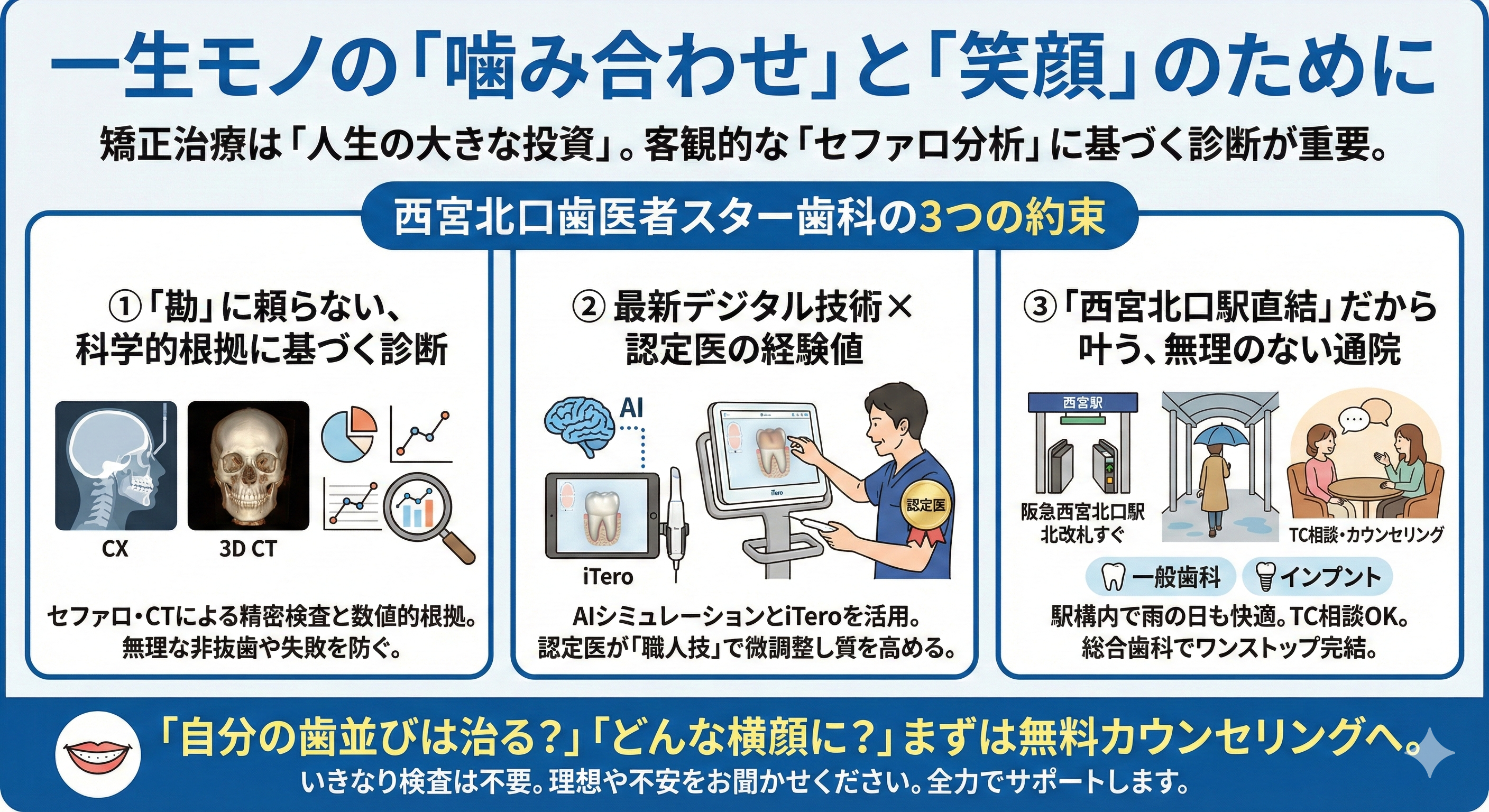 「歯を抜かないと治らないと言われた」「逆に、抜かずに治せると言われたが口元が出っ張ってしまった」 このようなトラブルの多くは、事前の分析不足や診断の甘さに起因することがあります。 西宮北口歯医者スター歯科では、以下のようなプロセスで、後悔のない治療計画を作成しています。