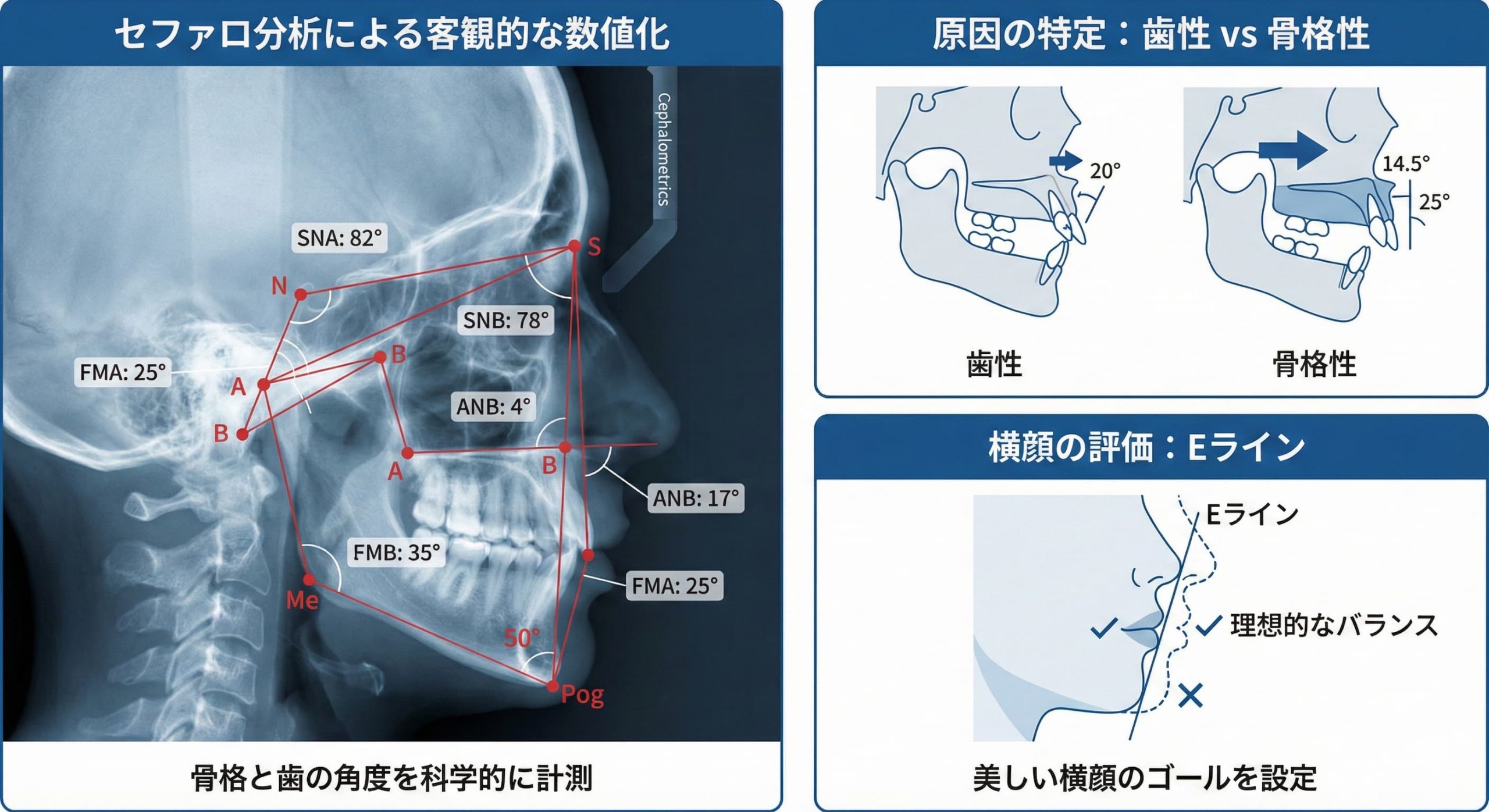 この違いを目視や勘だけで判断するのは非常に危険です。セファロ分析では、基準点(S点、N点など)を結んだ角度や距離を計測し、「平均値と比べてどのくらいズレているか」を数値化します。これにより、「歯を抜くべきか」「どのくらい下げるべきか」という治療方針を、科学的根拠(エビデンス)に基づいて決定できるのです。
